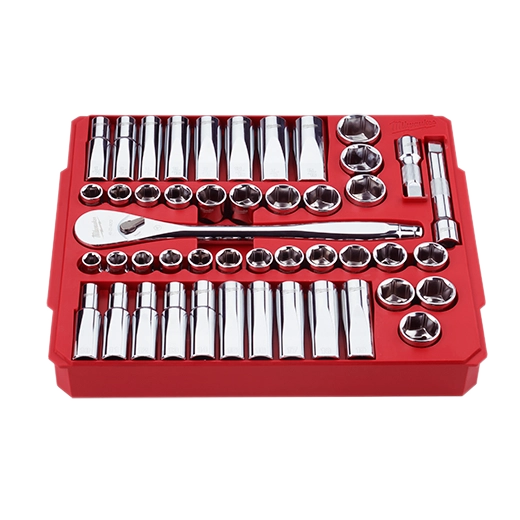 Nuestro juego de carraca y llave de vaso de 47 piezas SAE y métrica de 1/2" ofrece un mejor acceso en espacios reducidos y la máxima resistencia de la herramienta. El trinquete de 90 dientes ofrece una oscilación de arco en 4° y un diseño de perfil delgado, para que pueda trabajar en espacios más estrechos. El juego de cubos de MILWAUKEE® cuenta con un innovador diseño de cubo compatible con llave con lados FOUR FLAT™ para evitar que rueden. La carraca de ½" dispone de vasos con tamaños grabados con láser en las caras planas para facilitar su lectura. Nuestra geometría de cubo optimizada permite reducir adicionalmente el redondeo y el desgaste de los pernos. El juego de carraca y llaves de vaso Milwaukee incluye un interior extraíble diseñado para ser almacenado a largo plazo en un cofre de acero y un duradero maletín de transporte para una máxima portabilidad. Los accesorios del juego garantizan que tendrá lo que necesita para abordar cualquier trabajo, tanto en el garaje como en el lugar de trabajo. El juego de carraca y llaves de vaso de 46 piezas SAE y métricas de ½" está respaldado por una garantía de por vida.